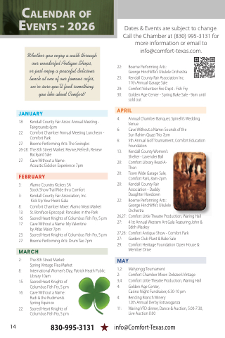Dates & Events are subject to change. Call the Chamber at (830) 995-3131 for more information or email to info@comfort-texas.com.