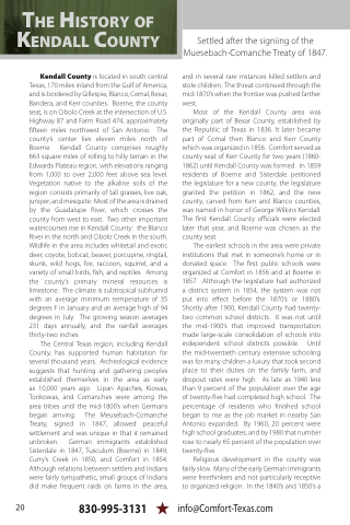 The Central Texas region, including Kendall County, has supported human habitation for several thousand years. Archeological evidence suggests that hunting and gathering peoples established themselves in the area as early as 10,000 years ago. Lipan Apaches, Kiowas, Tonkowas, and Comanches were among the area tribes until the mid-1800’s when Germans began arriving. The Meusebach-Comanche Treaty, signed in 1847, allowed peaceful settlement and was unique in that it remained unbroken. German immigrants established Sisterdale in 1847, Tusculum (Boerne) in 1849, Curry’s Creek in 1850, and Comfort in 1854. Although relations between settlers and Indians were fairly sympathetic, small groups of Indians did make frequent raids on farms in the area,
