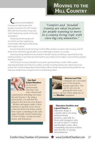 Comfort and Kendall/Kerr Counties are ideal locations for people moving into the Hill Country. Both o er the amenities of big cities while maintaining a small community atmosphere.