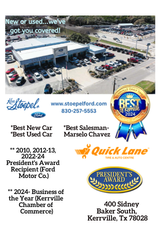 *Best New Car *Best Used Car ** 2010, 2012-13, 2022-24 President's Award Recipient (Ford Motor Co.) ** 2024- Business of the Year (Kerrville Chamber of Commerce) *Best Salesman- Marselo Chavez 400 Sidney Baker South, Kerrville, Tx 78028