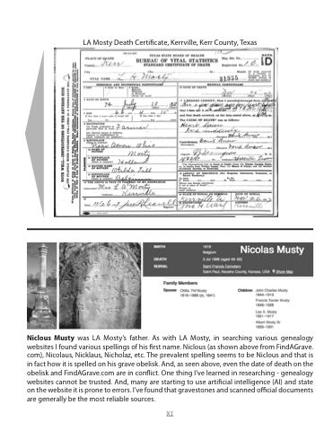 niclous musty was LA Mosty’s father. As with LA Mosty, in searching various genealogy websites I found various spellings of his rst name. Niclous (as shown above from FindAGrave. com), Nicolaus, Nicklaus, Nicholaz, etc. The prevalent spelling seems to be Niclous and that is in fact how it is spelled on his grave obelisk. And, as seen above, even the date of death on the obelisk and FindAGrave.com are in con ict. One thing I’ve learned in researching - genealogy websites cannot be trusted. And, many are starting to use arti cial intelligence (AI) and state on the website it is prone to errors. I’ve found that gravestones and scanned o cial documents are generally be the most reliable sources.