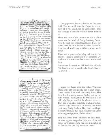 About the turn of the century we had a place leased on the head of Camp Meeting Creek. Now the back part of the Hays Ranch. It was my job to farm the little eld & see after the cattle. Sometimes I would stay out there a whole week alone.