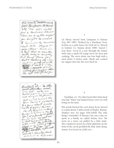 LA Mosty moved from Lampasas to Kansas City, MO 1883. Worked for a Hardware Store & then as a cattle buyer for Swift & Co. Moved to Sumner Co. Kansas about 1889. Stayed 1 year there. Lived in a tent through the winter with only a small Oil Lamp Stove for heat and cooking. The stove about one foot high with a wick about 4 inches wide. Mush was cooked for supper then the left over fried for ...