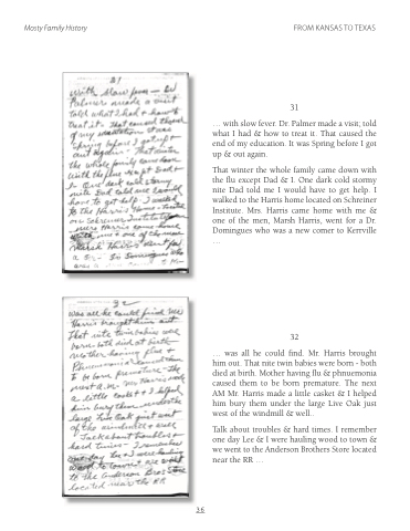 That winter the whole family came down with the u except Dad & I. One dark cold stormy nite Dad told me I would have to get help. I walked to the Harris home located on Schreiner Institute. Mrs. Harris came home with me & one of the men, Marsh Harris, went for a Dr. Domingues who was a new comer to Kerrville ...