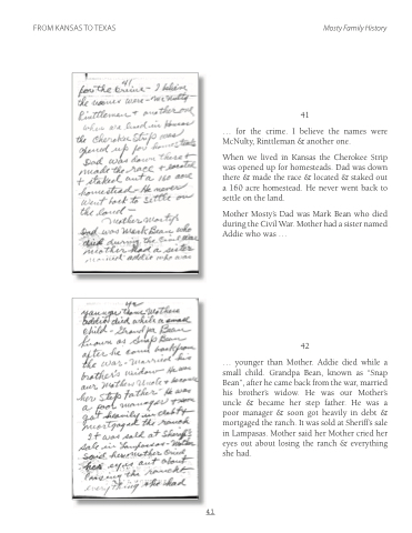 ... younger than Mother. Addie died while a small child. Grandpa Bean, known as “Snap Bean”, after he came back from the war, married his brother’s widow. He was our Mother’s uncle & became her step father. He was a poor manager & soon got heavily in debt & mortgaged the ranch. It was sold at Sheriff’s sale in Lampasas. Mother said her Mother cried her eyes out about losing the ranch & everything she had.