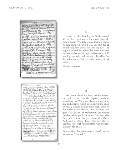 ... Mr. Jump closed his little Sunday School. He took Lee & I to the Baptist church & introduced us. The good Baptists took us in like millionaires. Asked us to sing in the choir & what a discord it must have been. Some of the leaders of the church - most of them now gone - Mr. & Mrs. AB Walliamson, the Morriss families, Grandpa & Grandma Morriss, Miss Patty Morris their daughter (now Mrs. Owen Anderson) of Alney, Texas. The AG Morriss families, Mrs. WH Rawson (Mrs. Carl Morriss’ mother), Mr. & Mrs. ...