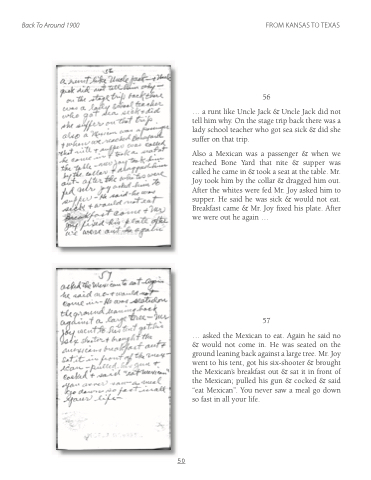 Also a Mexican was a passenger & when we reached Bone Yard that nite & supper was called he came in & took a seat at the table. Mr. Joy took him by the collar & dragged him out. After the whites were fed Mr. Joy asked him to supper. He said he was sick & would not eat. Breakfast came & Mr. Joy xed his plate. After we were out he again ...