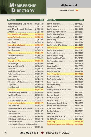 1HOME4U Realty Group, Keller Williams (830) 353-7300 702 High Street, LLC (214) 718-1144 A Lazy S Place Dog Friendly Guesthouse (214) 293-5655 AIP Hospice (210) 260-0000 Alamo Meat Market & Provisions (830) 995-5509 America Reclaimed (830) 353-2663 Apache Ri eworks (210) 972-3604 Atmos Energy (888) 286-6700 Bandera Electric Co-Operative (866) 226-3372 Bandit Bin Cleaners (830) 357-1381 Bandit Bin Cleaners (830) 357-1381 BCI Custom Homes, Inc (830) 249-3001 Bee Creek Communications (830) 990-1258 Ben E Keith Co (325) 247-4224 Bending Branch Winery (830) 995-2948 Blue Heron Yoga (830) 431-2656 Boerne Kendall County EDC (830) 331-9070 BONTe Spa (830) 496-0781 Boys & Girls Club of Comfort (830) 995-2540 Braden Dermatology (830) 995-3376 Brene’s Kitchen (830) 314-1002 Bunkhouse on High (830) 481-6133 C&F Heating and Air Conditioning, Inc (830) 257-7181 Camp Capers (830) 995-3966 Capital Farm Credit (830) 257-4444 Care Choice of Boerne (830) 249-2594 CasaKeepers Design & Remodel (830) 955-7888 Cave Without A Name (830) 537-4212 Cedar Eaters of Texas (210) 745-2743 Center Point Legacy Enterprises (917) 710-3111 Central Texas Electric Co-Op (830) 997-2126 Cocky Rooster Bar (830) 256-7491 Coldwell Banker D’Ann Harper Realtors (210) 912-6290 Colibri Magic (703) 310-9324 Comfort Antique Mall (830) 995-4678 Comfort Area Farmers Market (830) 446-9631 Comfort Area Foundation (830) 624-9120 Comfort Baptist Church (830) 995-3638 Comfort Botanical Apothecary & Gathering Space