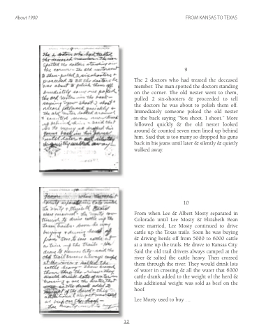 From when Lee & Albert Mosty separated in Colorado until Lee Mosty & Elizabeth Bean were married, Lee Mosty continued to drive cattle up the Texas trails. Soon he was buying & driving herds off from 5000 to 6000 cattle at a time up the trails. He drove to Kansas City. Said the old trail drivers always camped at the river & salted the cattle heavy. Then crossed them through the river. They would drink lots of water in crossing & all the water that 6000 cattle drank added to the weight of the herd & this additional weight was sold as beef on the hoof.