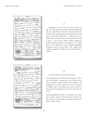 ... looking for us & took us to their camp on the Gus Nois farm a few miles below Menard on the San Saba River. Dad & Lee had worked the winter there grubbing & clearing bottom land that was heavily timbered - at $4.00 an acre. When they measured up in the Spring they had 4 acres - $16 for the entire winter. Spring & summer Dad worked in the elds at 75ยข a day & Lee was thrown in extra helping handling irrigation water in the elds. We caught lots of large cat sh & rolled in meal & baked in a skillet ...