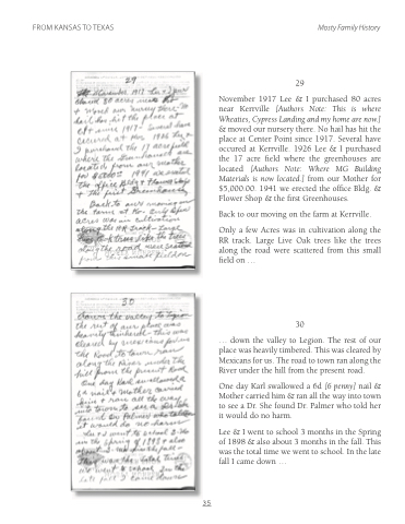 November 1917 Lee & I purchased 80 acres near Kerrville [Authors Note: This is where Wheaties, Cypress Landing and my home are now.] & moved our nursery there. No hail has hit the place at Center Point since 1917. Several have occured at Kerrville. 1926 Lee & I purchased the 17 acre eld where the greenhouses are located [Authors Note: Where MG Building Materials is now located.] from our Mother for $5,000.00. 1941 we erected the of ce Bldg. & Flower Shop & the rst Greenhouses.